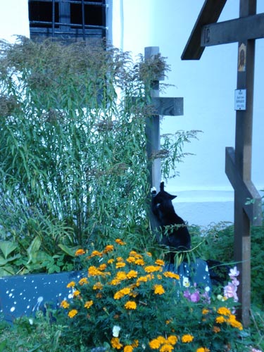 Осень, бабье лето - благодатная пора, особенно, когда есть фотоаппарат для того, чтобы все это сфотографировать. Потом опять же все время приходится помнить, что скоро осень уже не будет такой благодатной, и даже при наличии фотоаппарата придется "сидеть дома и пить чай с конфетами" (как советовал сайт по макросъемке поступать фотографам в дождливую погоду  Вот, а пока все хорошо - выгуливаю фотик. И заносит меня во время этих путешествий в места уж совершенно неожиданные. Например - на улицу Бурмагина: всего несколько шагов в сторону от Соборной горки - и попадаешь... Даже и не описать так сразу куда, настолько противоречивые чувства: остовы разрушенных церквей, деревянные развалюхи остро пахнущие старыми сортирами, бомжеватого вида личности, и в то же время - великолепные церкви, некоторые даже неплохо сохранившиеся. Понимаешь - что вся эта часть города (а не только пресловутый Прибрежный комплекс) стоит на разрушенных могилах. Впрочем, забурилась я туда не готики ради, а за гламуром. Несколько удачных фотографий ПОТРЯСАЮЩИХ ПО КРАСОТЕ храмов мне все-таки удалось сделать. Но сейчас все-таки будет "жесткая готика"  ). Вот, например, этот кот: пока я фотографировала - терся рядом с крестами.  А потом запрягнул на крест и откровенно начал позировать.