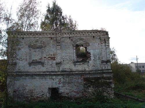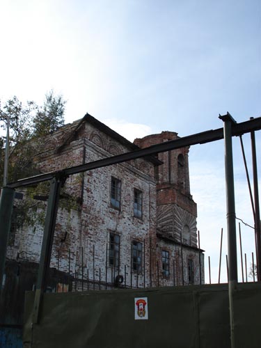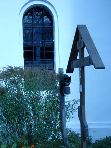 Сперва у меня было чувство, что это какой-нибудь Кот Бабы Яги, но когда он стал драть крест когтями, а потом вообще забрался на него как на насест... Стало как-то жутковато... А вот развалины церкви рядом с тем местом, где гуляет черный кот. Наверное, когда-то этот храм был очень красивым, а сейчас - на нем даже истлела табличка, оповещающая окрестную шпану о том, что это церковь и глумиться над ее останками - грех... Почему-то подумалось, что писал это объявление тот священник, который похоронен в новой могиле рядом с церквью...