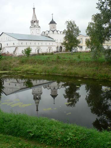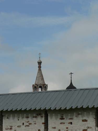 Диалог вчерашний: -Ты сделала что собиралась? -В смысле? -Ну, ты штатив сходила посмотрела, где я сказал? -Нет, не посмотрела, конечно... Когда мне штативы-то смотреть? Вчера я ходила на свидание, сегодня в монастырь ездила... Ну, про монастырь можно поподробнее... Подруга скоро уезжает из Вологды и даже из страны: "Поехали, говорит, я там пять лет не была..." Ну, я так чуть и не больше. С утра собрались, посмотрели на сгущающиеся на небе тучи и решили, что дождя не будет. После чего я собрала ребенка, фотоаппарат и мы поехали путешествовать. О перепетиях дороги рассказывать нечего, а вот в самом монастыре... За те годы, что мы там не были - многое изменилось. Перво-наперво потряс запрет фотографировать на монастырской территории...Строгий-престрогий бородатый привратник отдельно доносил эту информацию до каждой пребывающей группы паломников. Мы несколько подобломались. После чего вырядились матрешками - в платочки с красными цветами и длинные черные юбки (вокруг меня эта юбка обмоталась три раза, а Лессеныша вообще пришлось запеленать). И побрели гулять. Добрый дяденька из числа "паломников" шепнул нам, что он все-таки сделал снимков 20 "скрытой камерой". Правда я зачем-то взяла огромную зеркалку "Панасоник" вместо маленькой "Соньки" - а такую незаметно не достанешь... Страшновато, что с фотоаппаратам тебя там поймают и проклянут  Снимки же из-за стены монастыря (со светской территории) получились довольно смешными: вот эти купала, например, интересуются: "Что там, в миру?" Причем один повыше - ему виднее, а маленький никак не может подпрыгнуть